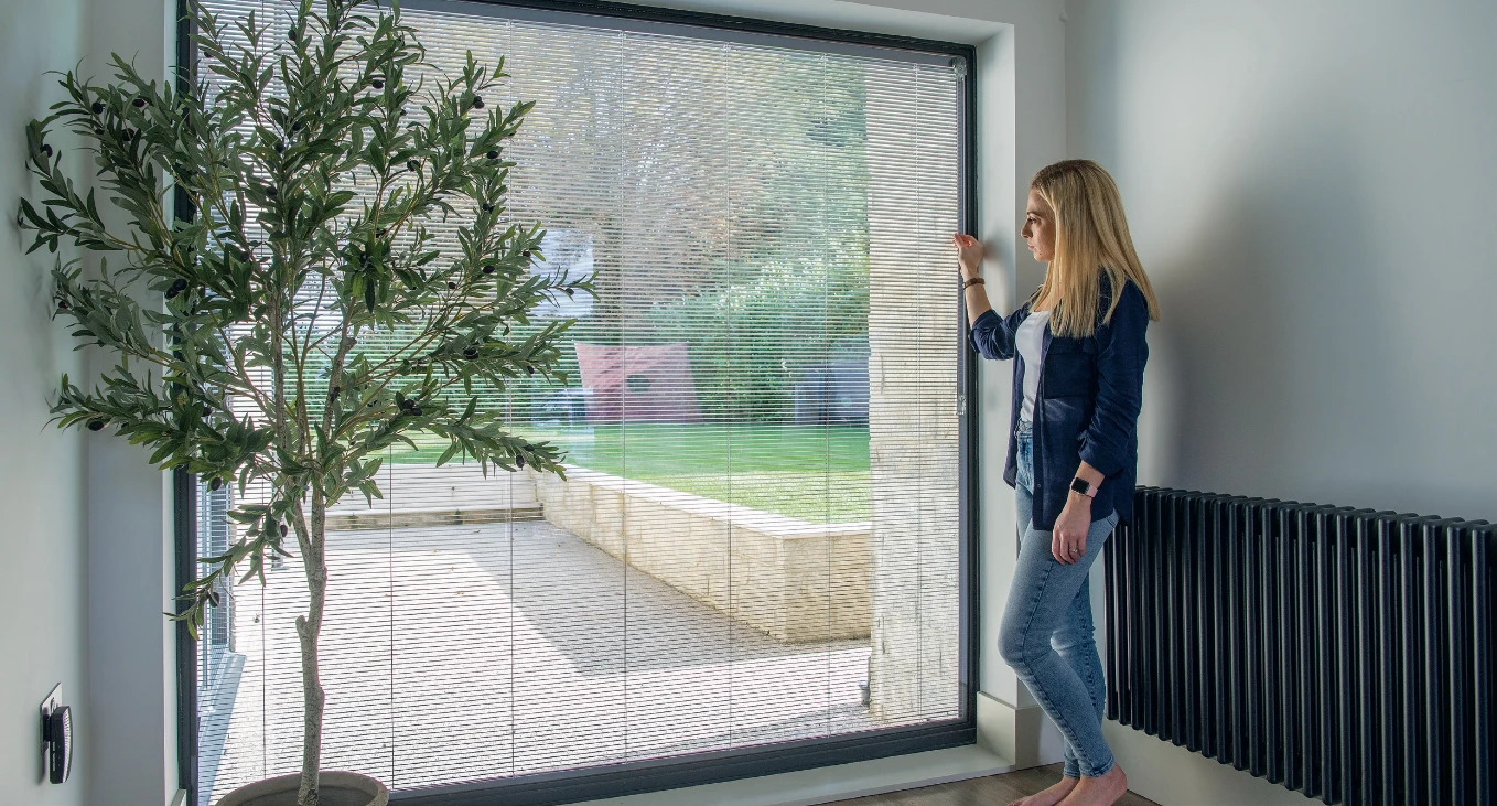 Enjoy clear views, instant privacy and effortless light control. Our integral Venetian blinds sit between the glass panes, so there’s no dusting, no dangling cords and nothing to catch on the sliding action. Tilt to cut glare and heat, lower for privacy, or raise for an open outlook – all with smooth fingertip control.